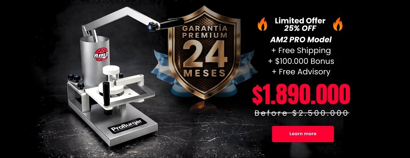 The AM2 ProBurger is the professional burger former designed for businesses that need to produce more, with less effort and total safety. Made of food-grade stainless steel, its three versions — GO, PRO, and EXPERT — allow you to produce from 300+ to 600+ hamburgers per hour, always with the same size and weight. Its robust and optimized design eliminates failures and hidden costs.